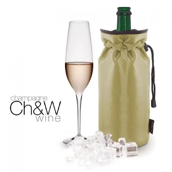 La nuevas bolsas de frío de Pulltex unen la efectividad de la mantas de frío habituales de Pulltex con la estética de las nuevas tendencias. Un acabado en tejido de alta resistencia blanco, que le confiere una imagen elegante y moderna, con un interior en nylon negro. Su interior con capa de “cool gel” y un material aislante que evita que el calor se disperse hacia el exterior de la bolsa. La bolsa se cierra por la parte superior con un cordón de seguridad para evitar que la botella salga del interior de la bolsa a la vez que evita que se escape el frío de la bolsa. Bolsa Enfriadora Oro Pulltex. Enfriador de Champagne. Producto diseñado por Pulltex. 109615