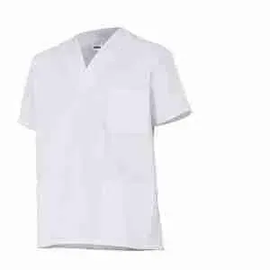 Con cuello de pico, manga corta y tres bolsillos de parche.