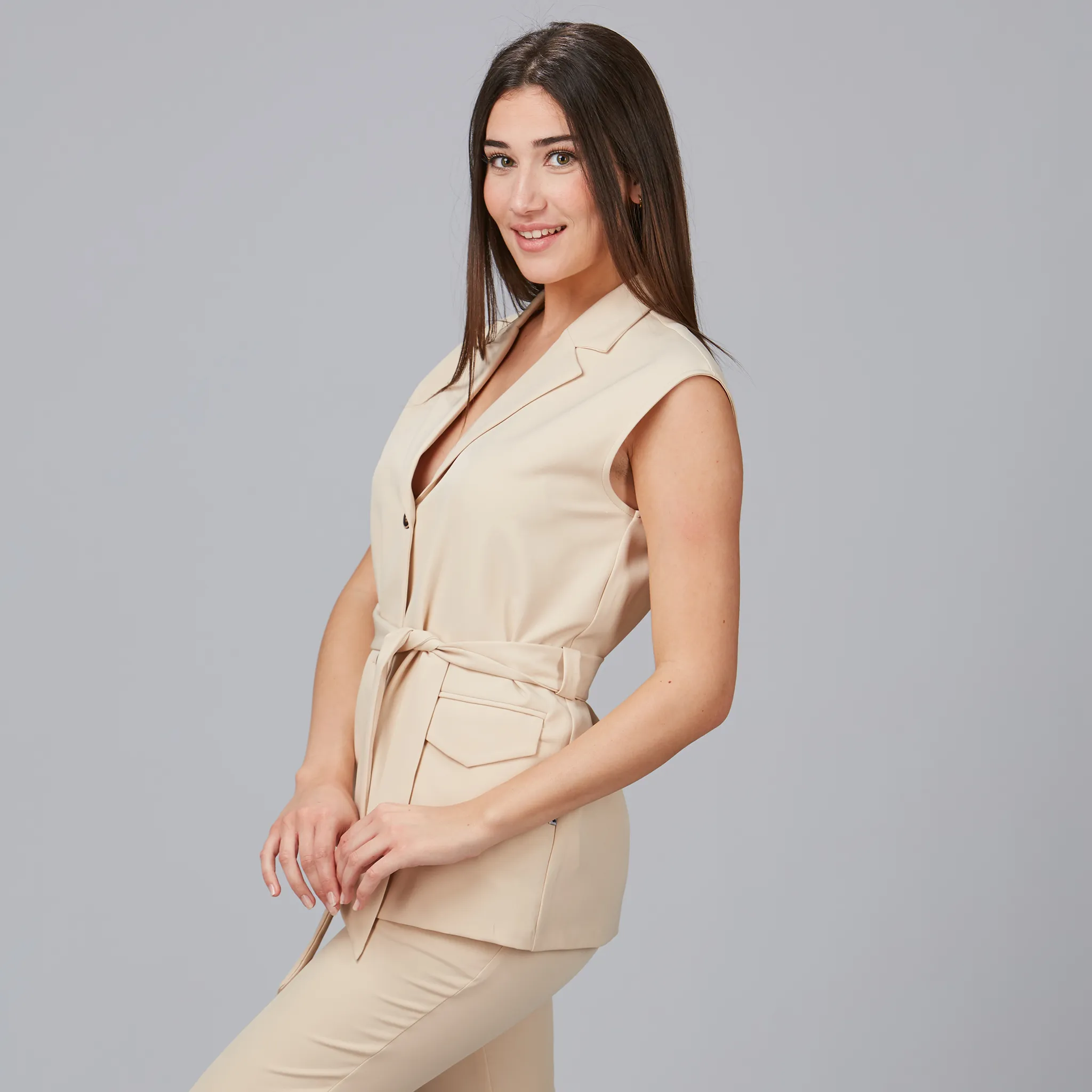 Con su solapa elegante y dos botones de pastilla en el delantero, el Chaleco Mujer Solapa ARABIS te permite lucir sofisticada y a la moda en cualquier entorno laboral. Disponible en tres colores atemporales: negro, beige y azul maya, este chaleco complementa cualquier conjunto con un toque de estilo único.