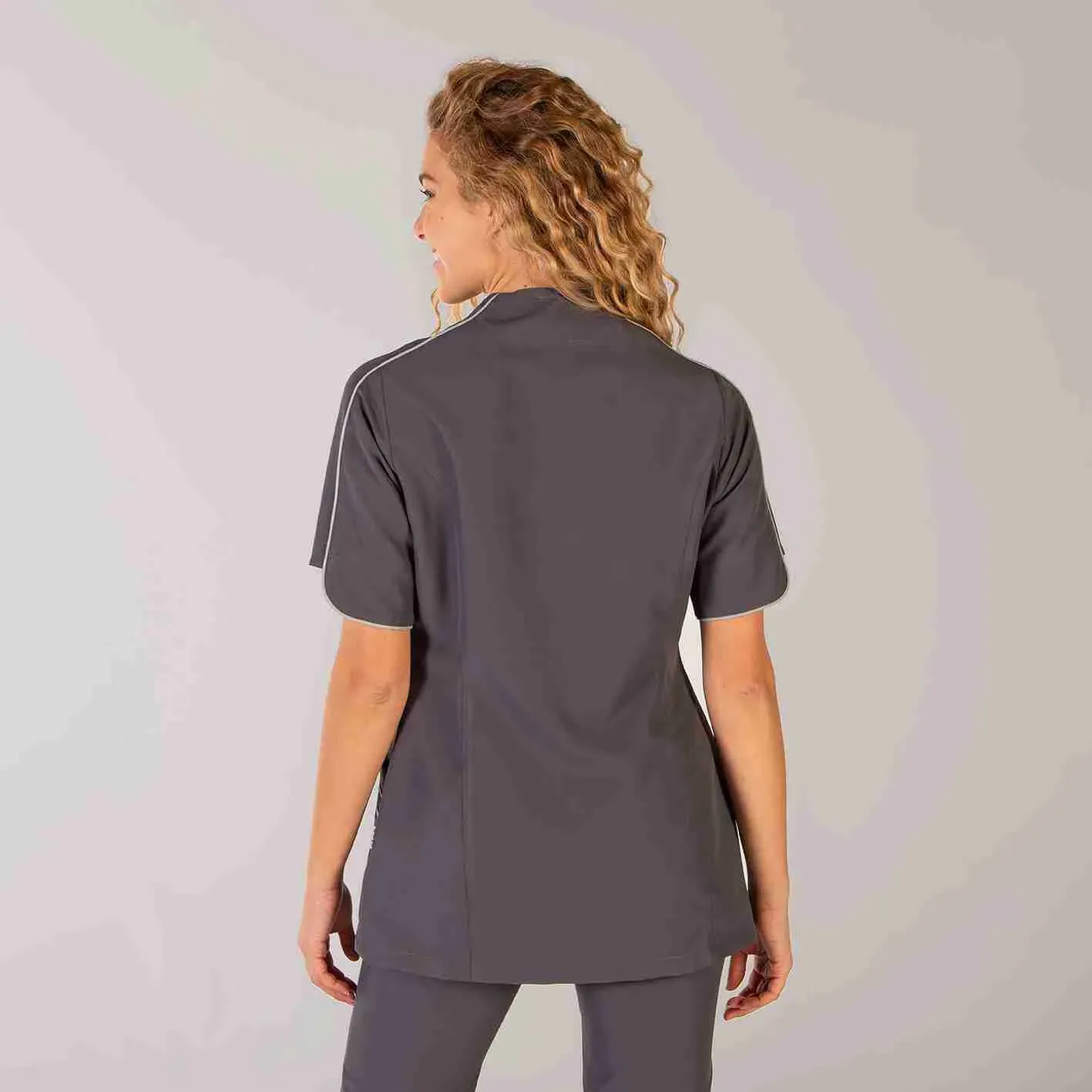 Casaca para mujer en manga corta, con cuello chimenea, cierre mediante botones de presión ocultos y dos bolsillos entre costadillos. Prenda semi ajustada, con costadillos en delantero y espalda. Confeccionada en MICROFIBRA de 100% Poliéster, un tejido antibacterias, altamente transpirable, tolerante a salpicaduras de lejía, lavable a 90º, seca rápido, sin necesidad de planchado y repelente al cabello y pelo de mascotas. Disponible en color blanco, malva o gris marengo, combinada en vivos de las mangas y bolsillos a contraste. Ideal para uniformes de enfermería, doctores y demás profesionales sanitarios en hospitales, clínicas y centros médicos, farmacia, laboratorio, veterinario o comercio.