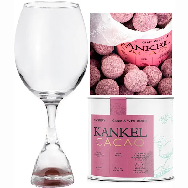 Si no quieres ir con manos vacías o simplemente quieres tener un detalle con alguien este mini pack que ocupa poco y pesa todavía menos una Copa Oficial de Rioja de 21 cm de alto y un canister con 12 Trufas de Cacao y Vino Tinto DOCa Rioja es ideal. Un detalle bonito para San Valentin o cualquier ocasión.