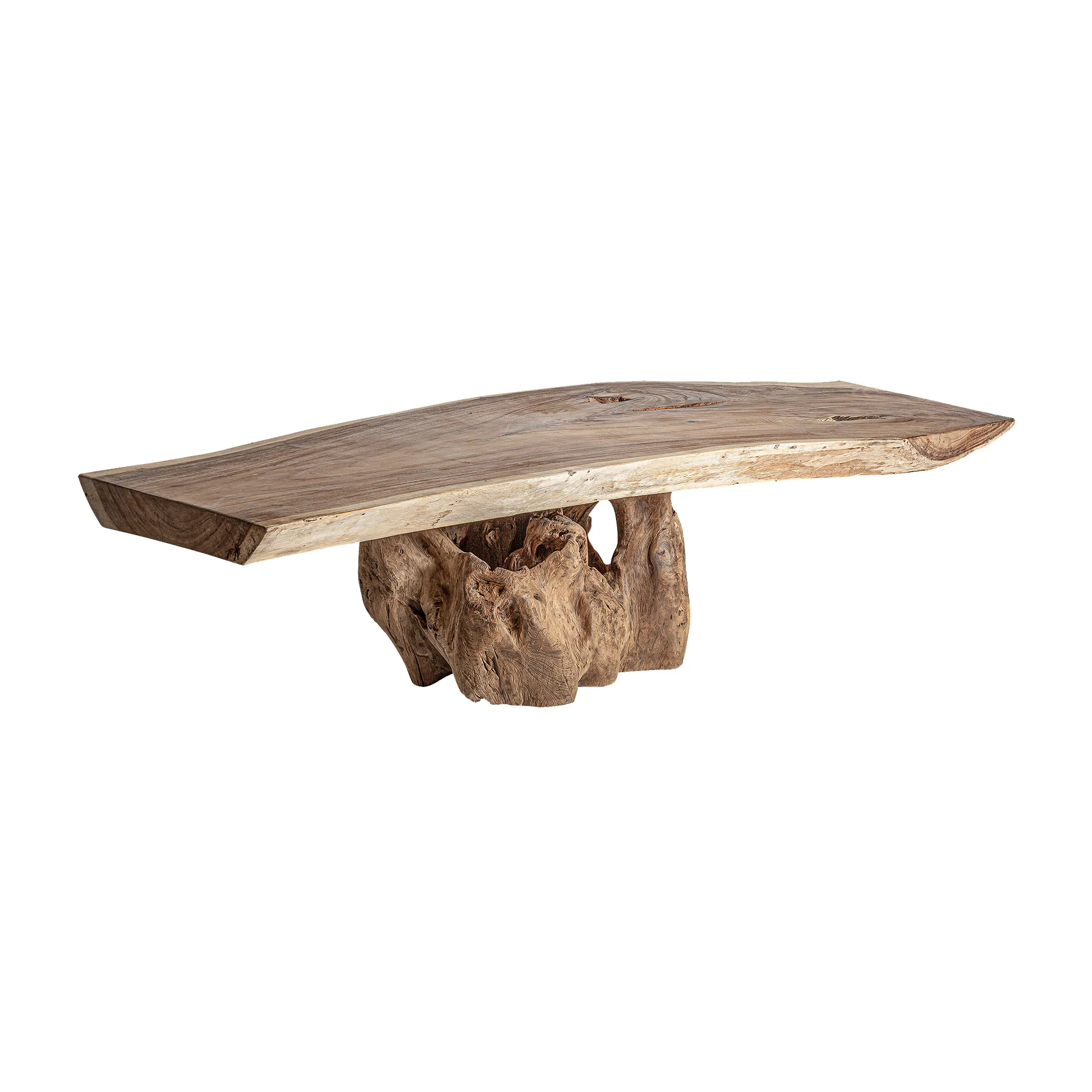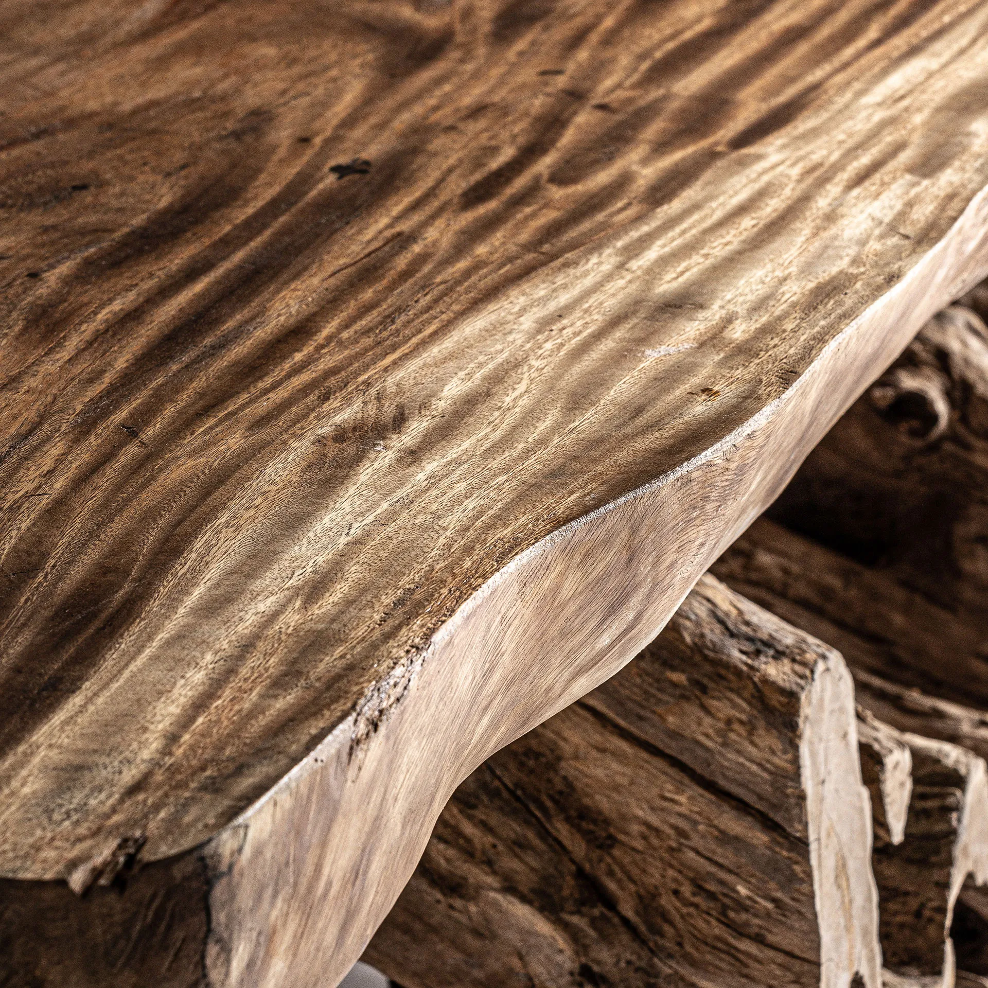 La Mesa Centro Baja Kenia es una pieza única de estilo rústico que utiliza raíces de madera Suar para ofrecer una interpretación moderna de la naturaleza en su máxima expresión. Con unas generosas dimensiones de 200 cm de ancho, 110 cm de fondo y 52 cm de alto, esta mesa se convierte en el centro de atención en cualquier espacio. Su acabado natural envejecido aporta una sensación cálida y acogedora, mientras que las variaciones, nudos y marcas en la madera aseguran que cada mesa sea irrepetible.