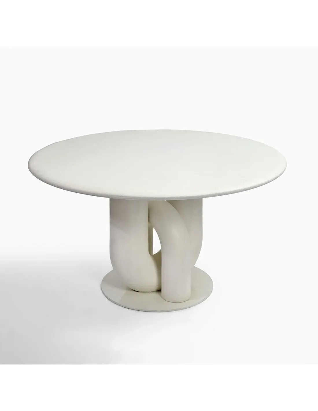 | Mesa de comedor redonda acabado cemento blanco. Este diseño de mesa de comedor con pata central formando dos arcos entrelazados no dejará indiferentes a tus invitados. Su base con plataforma redonda le aportan estabilidad. Es sofisticada y dará mucha personalidad y estilo moderno y contemporáneo a tu ambiente. Perfecta para tu comedor, hall de grandes dimensiones o la oficina más especial.