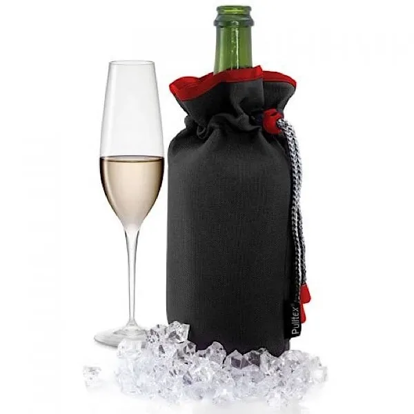 Bolsas de frío para enfriar botellas sobre la mesa o para mantener el frío de la botella salida de la nevera durante toda la comida. Se debe guardar en el congelador para que esté lista cuando sea necesario. La nuevas bolsas de frío de Pulltex unen la efectividad de la mantas de frío habituales de Pulltex con la estética de las nuevas tendencias. Un acabado en tejido de alta resistencia que le confiere una imagen elegante y moderna, con un interior en nylon negro. Su interior con capa de “cool gel” y un material aislante que evita que el calor se disperse hacia el exterior de la bolsa. La bolsa se cierra por la parte superior con un cordón de seguridad para evitar que la botella salga del interior de la bolsa a la vez que evita que se escape el frío de la bolsa.
