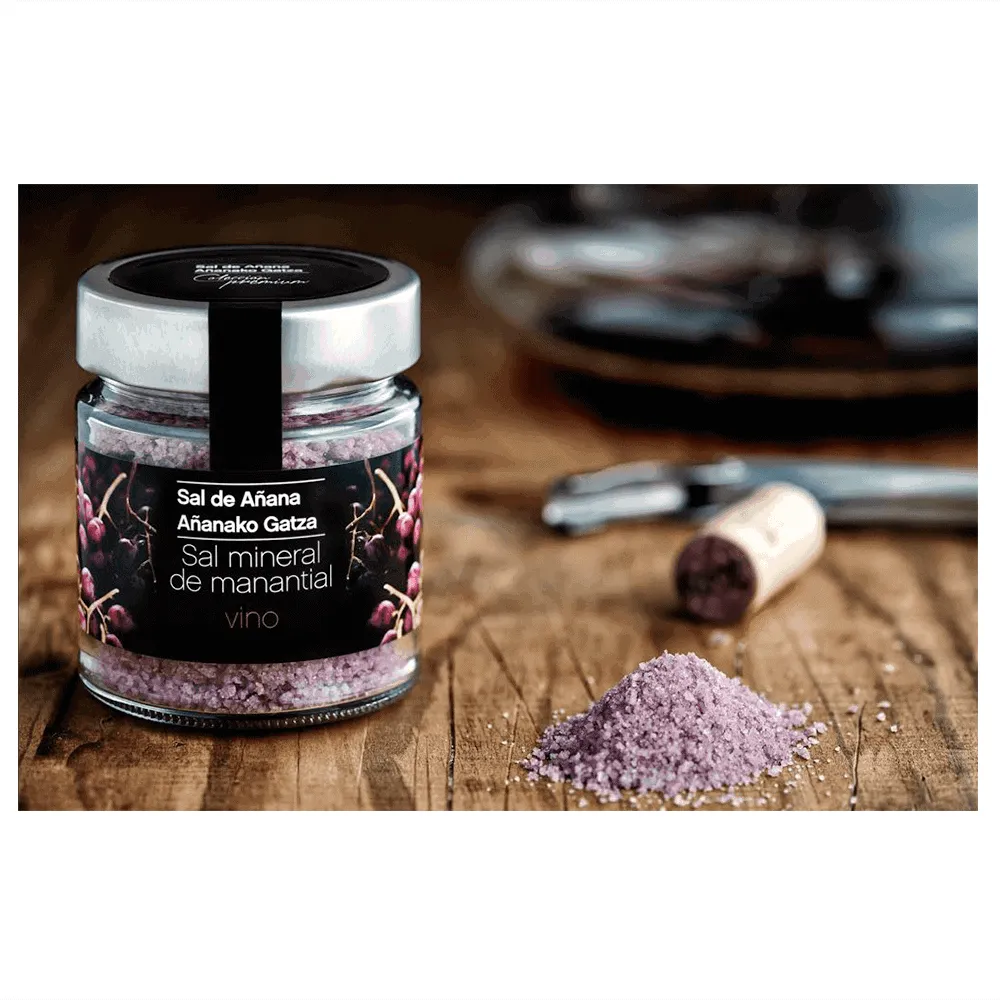 Maridaje de la escama de flor de sal con vino tinto de Rioja Alavesa que al dejar secar aporta el aroma y sabor de VINO TINTO.