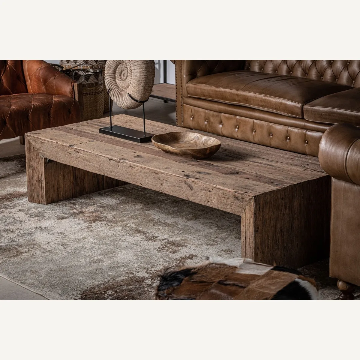 La Mesa de Centro SAMSOM, con sus generosas dimensiones de 160x70x40cm, es una oda a la sostenibilidad y el diseño contemporáneo. Hecha de madera de pino reciclado y con un acabado natural envejecido, esta mesa de centro grande es el punto focal ideal para reuniones familiares o veladas con amigos, brindando estilo y ética en cada detalle.