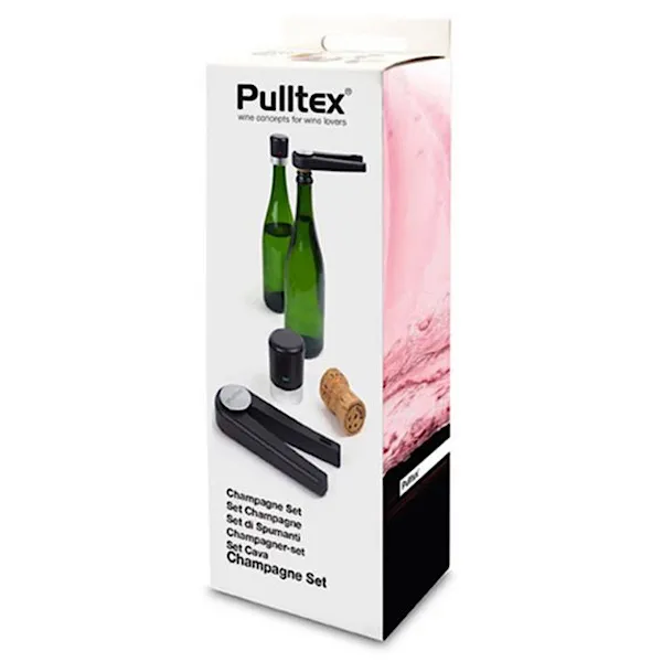 Pulltex ha desarrollado este pack de accesorios básicos para cualquier amante de los vinos espumosos. Dentro del set podrás encontrar un sacacorchos para cavas o pinza de extracción para corchos de botellas de champagne y otros espumosos, y un tapón de seguridad para guardar tu espumoso sin que pierda sus propiedades.