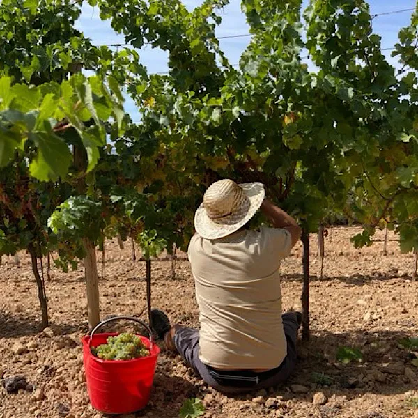Vendimia manual en cajas de 12- 14 kg. Selección de racimos en mesa.