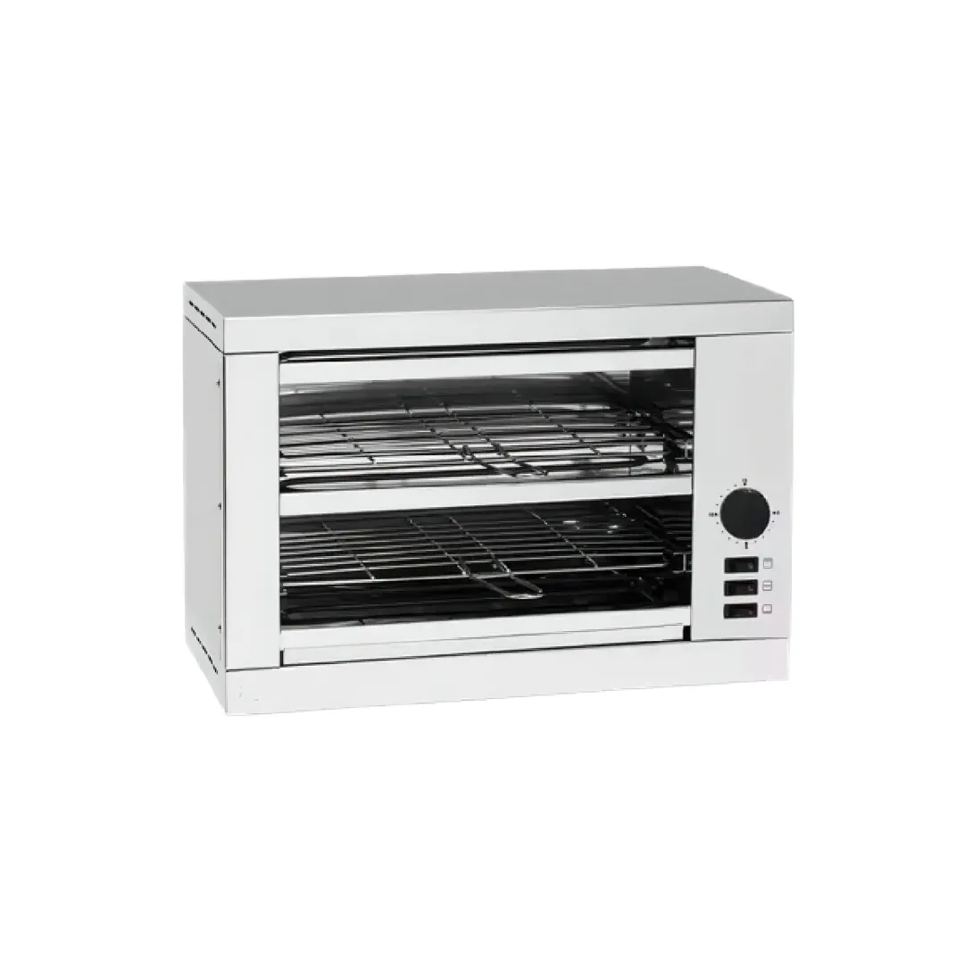 Este tostador eléctrico de 2 pisos está diseñado para un uso intensivo en cocinas profesionales, cafeterías, buffets y hoteles. Equipado con resistencia blindada para una mayor durabilidad y eficiencia térmica, garantiza un tostado uniforme y rápido en cada uso.