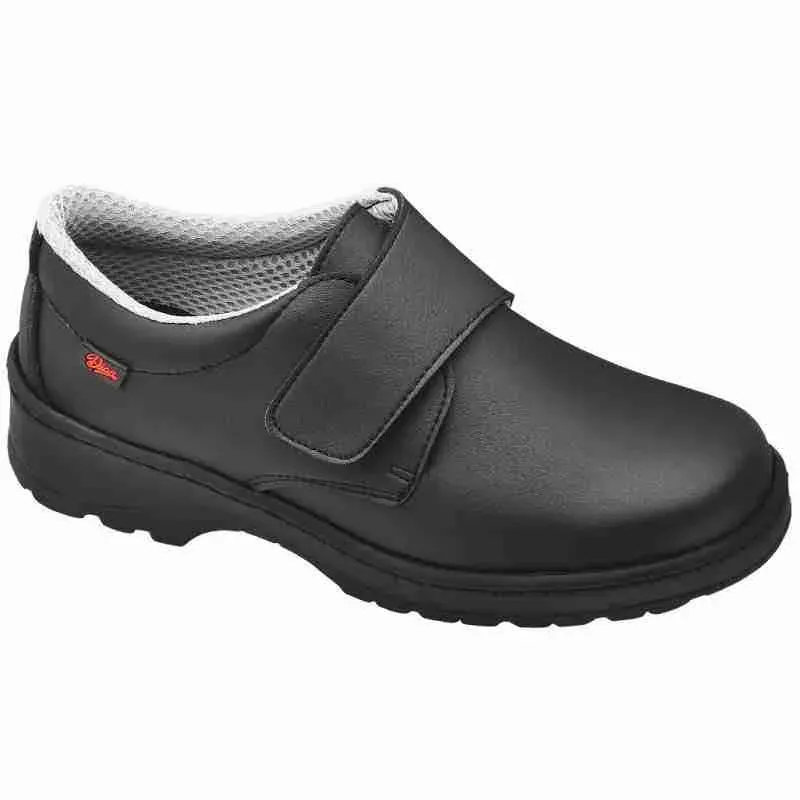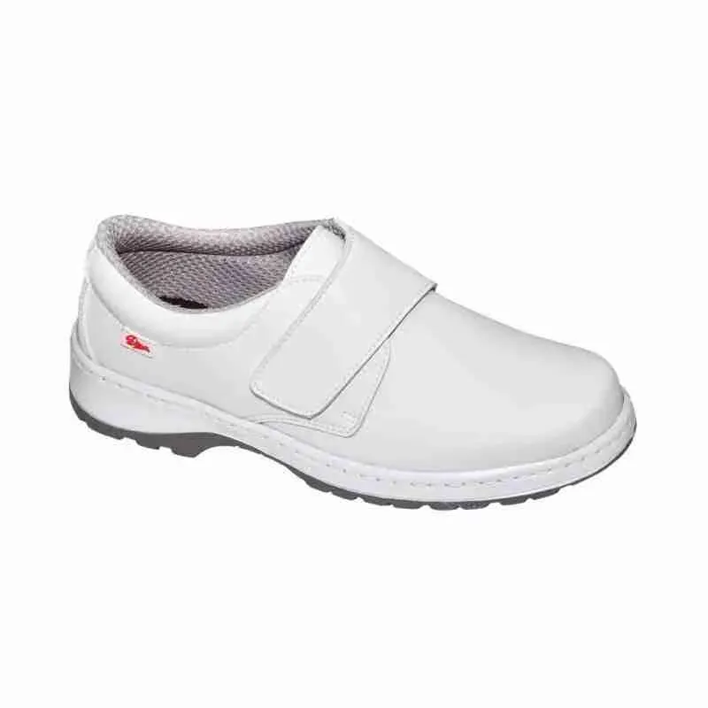 Zapato con cierre de velcro. Pala de piel de microfibra forrada interiormente. Altamente transpirable, con gran capacidad de absorción a la humedad y rápido secado. Plantilla acolchada de tejido sobre espuma de poliuretano con tratamiento antibacterias ycarbón activado. Suela antideslizante. Fabricado mediante montado y cosido de seguridad para reforzar la unión de la suela al corte del zapato. Lavable en frío y caliente hasta 40º.